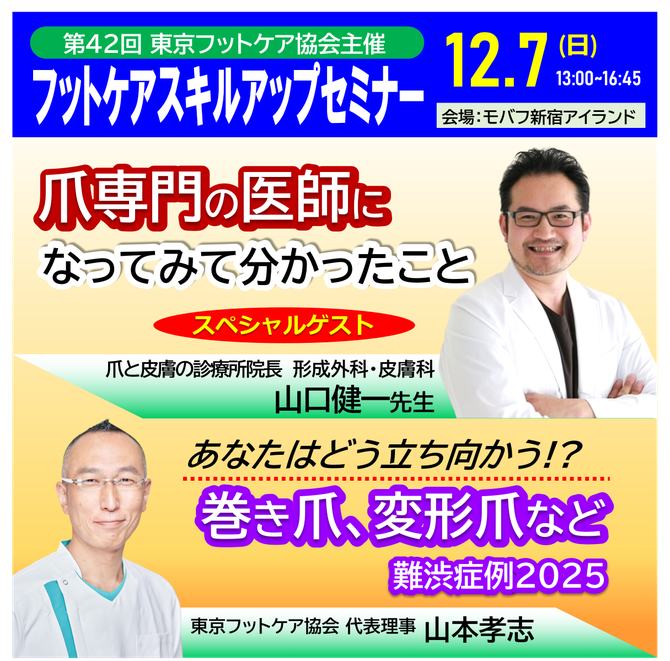 また、当協会代表理事の山本孝志は、「あなたならどう立ち向かう!?巻き爪、変形爪など 難渋症例2025」というテーマで講演を致します。2025年に出会った症例をもとに、ケア方法や技術について解説をする予定です。トラブル爪のケアで日々お悩みの方にとって、参考になる内容になると思います。